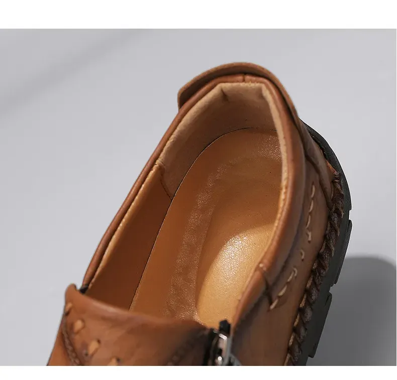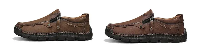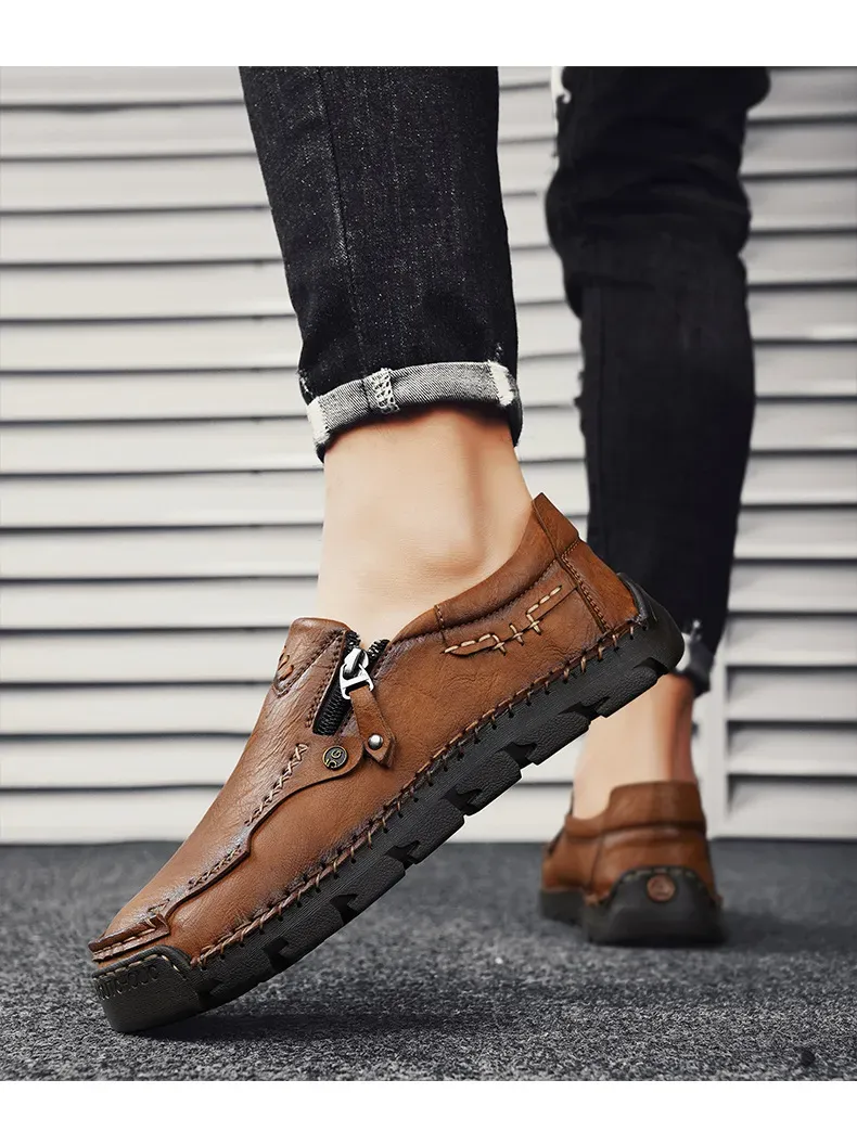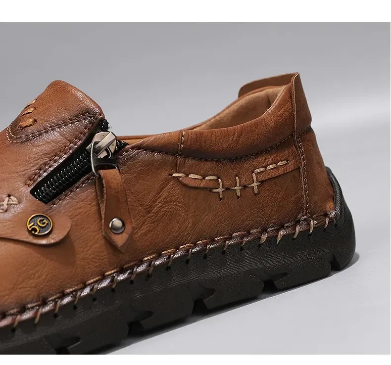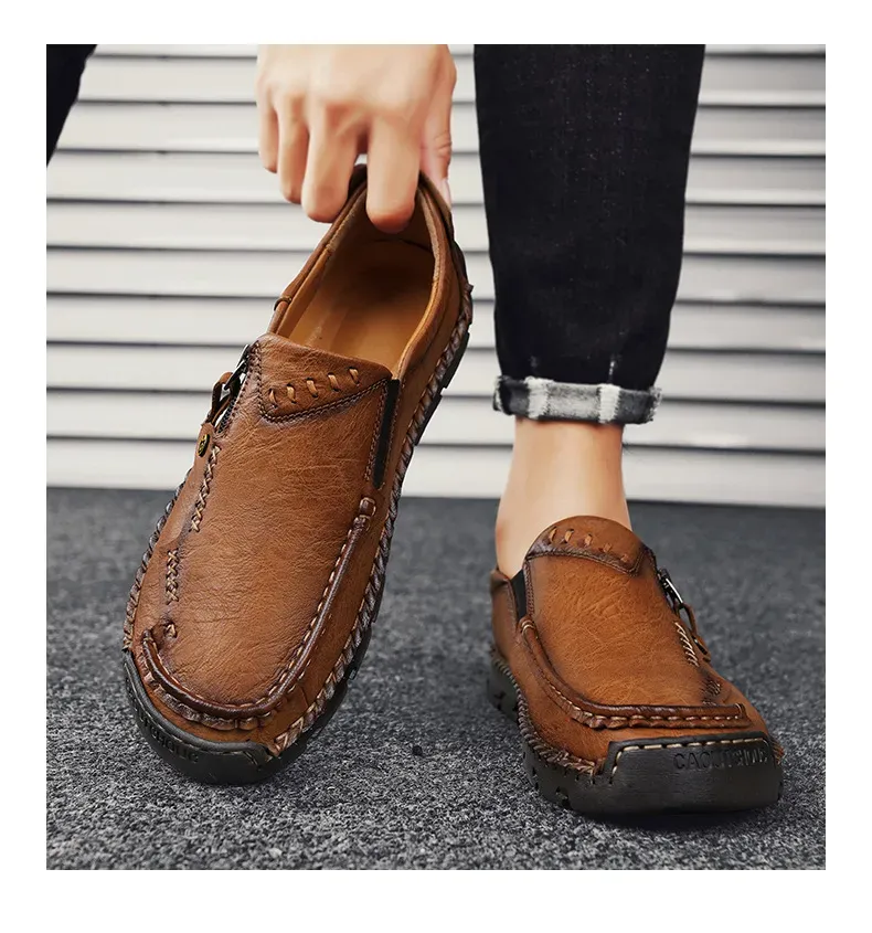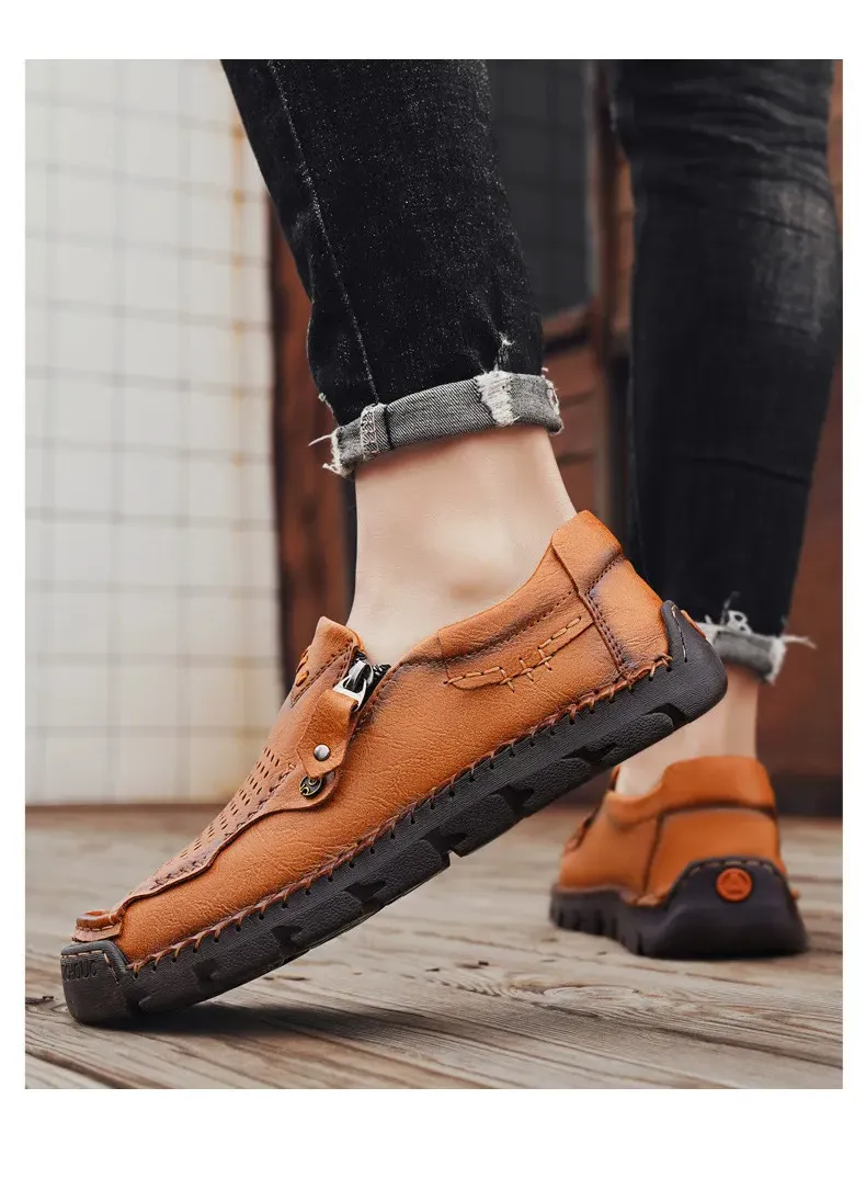 Herren-Slipper aus echtem Leder mit Reißverschluss, bequeme Freizeitschuhe, rutschfeste Gummisohle, atmungsaktiver Retro-Stil.